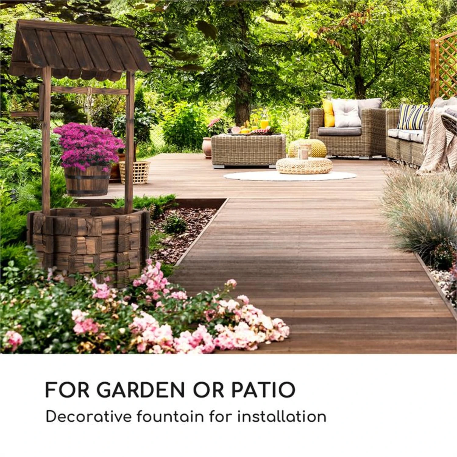Damit der Zierbrunnen lange seine schöne Gestalt bewahrt, wurde das Holz durch Flame Shielding Treatment einer aufwändigen Brandbehandlung unterzogen. Derartig geflammt ist es nicht nur der Witterung gewachsen: Der Brunnen erhält gleichzeitig zusätzliches Flair durch die künstlich gealterte Oberfläche – als hätte der Brunnen schon Jahrhunderte an seinem Platz überdauert.
