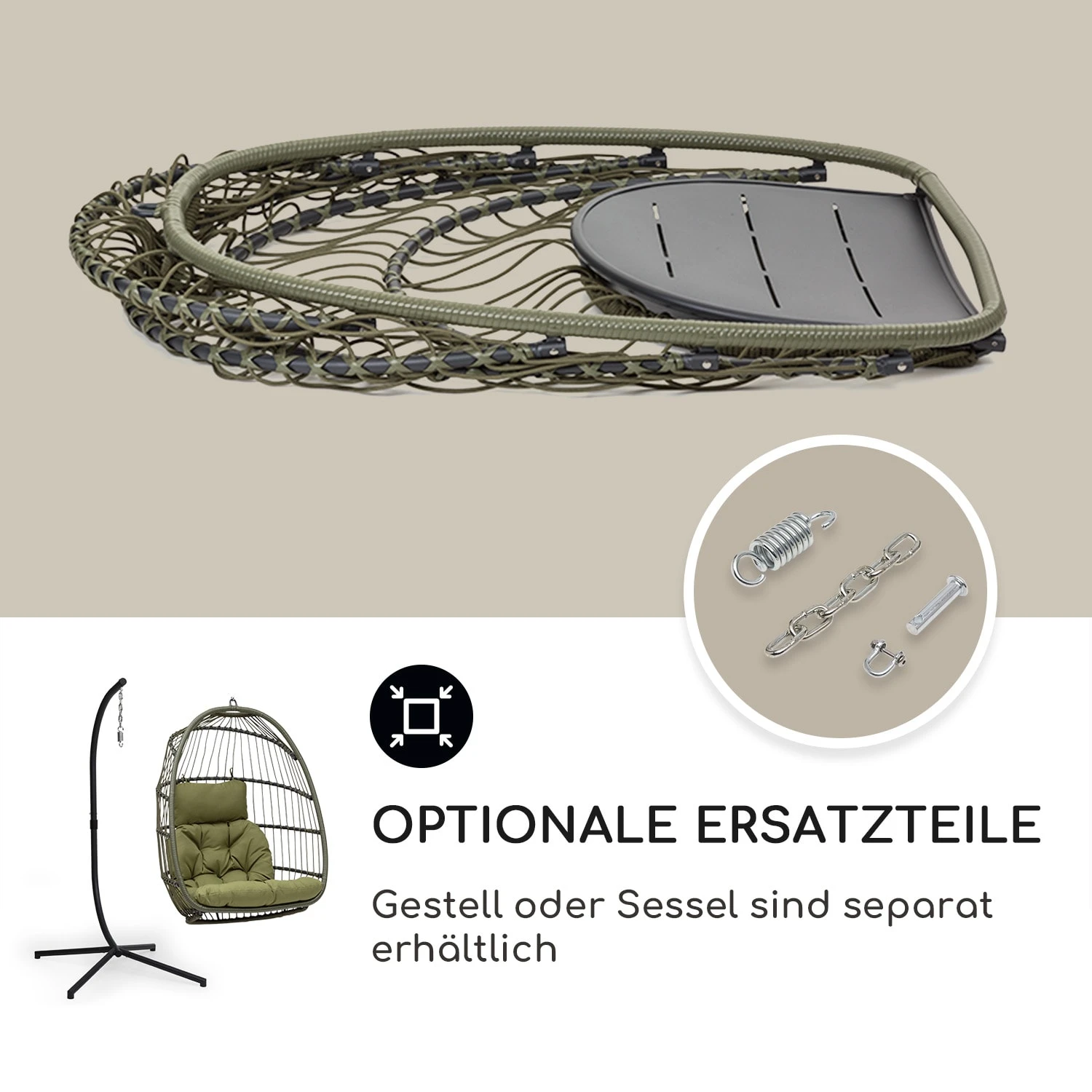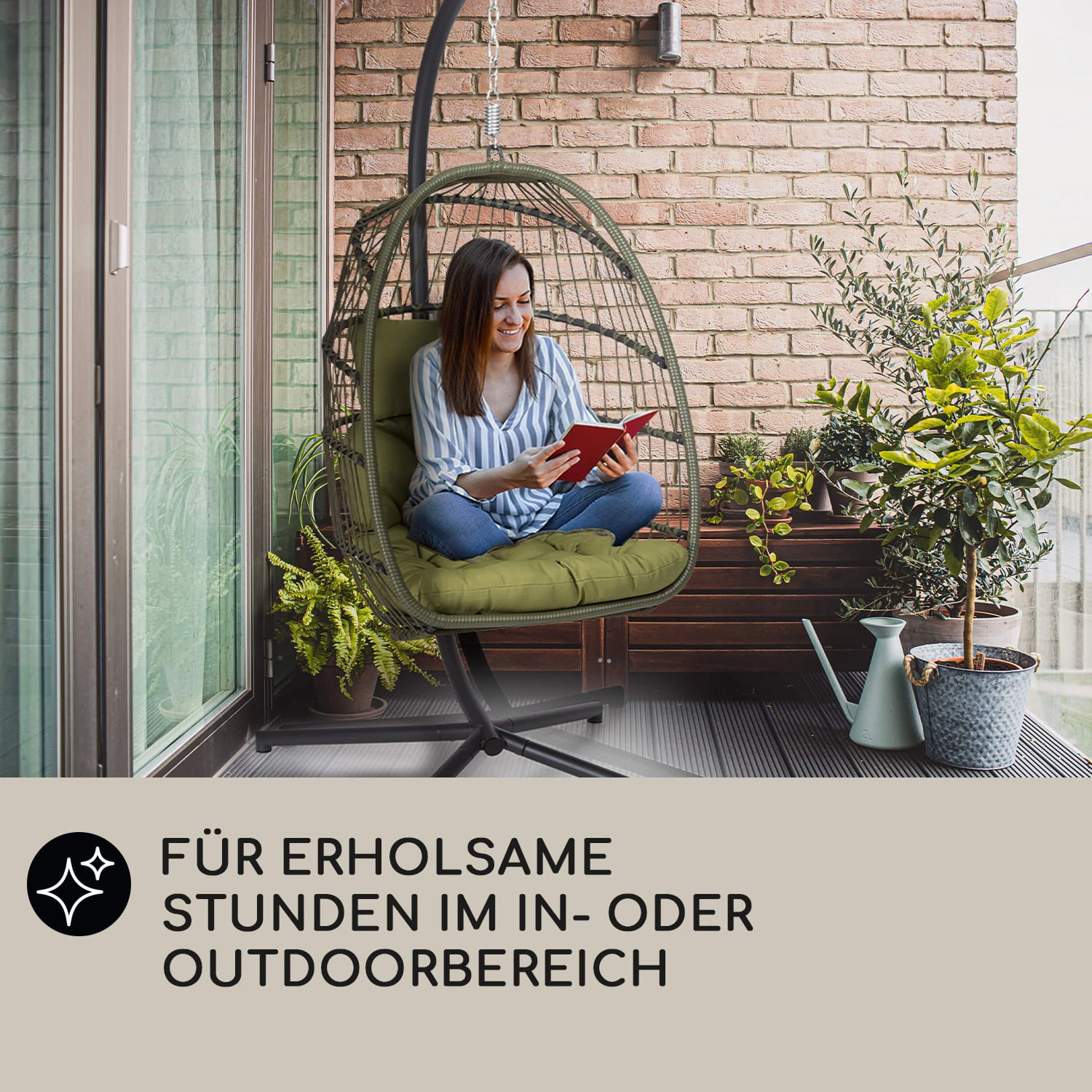 Egal ob in der frischen Luft am Golf von Biskaya oder auf dem Balkon â im blumfeldt Biarritz Individuelle HĂ€ngesessel ist Entspannung wie in der Belle Epoque garantiert. Die Sitzkugel aus bespannten Aluminiumrohren mit Polyrattan und Nylonseilen bietet reichlich Platz fĂŒr eine Person und wird durch ihr extradickes Sitzpolster aus Polyester besonders kuschelig. Die AufhĂ€ngung mit Stahlfeder und -kette sorgt fĂŒr die nötige Sicherheit und versetzt die Sitzkugel in sanfte Schwingbewegungen beim Entspannen. Damit der HĂ€ngesessel die nötige StabilitĂ€t und Robustheit erhĂ€lt, ist der witterungsbestĂ€ndige Rahmen aus pulverbeschichtetem Aluminium gefertigt. So ist der gesamte HĂ€ngesessel nicht nur ausgesprochen leicht, sondern hĂ€lt auch einer Belastung von bis zu 130 kg Gewicht problemlos stand. Als Montagesatz geliefert kann der blumfeldt Biarritz Individuelle HĂ€ngesitz im Nu aufgebaut und fĂŒr den bequemen Transport mit wenigen Handgriffen wieder abgebaut werden. Dabei ist es besonders praktisch, dass sich die Sitzkugel zusammenfalten lĂ€sst und so besonders wenig Platz benötigt.