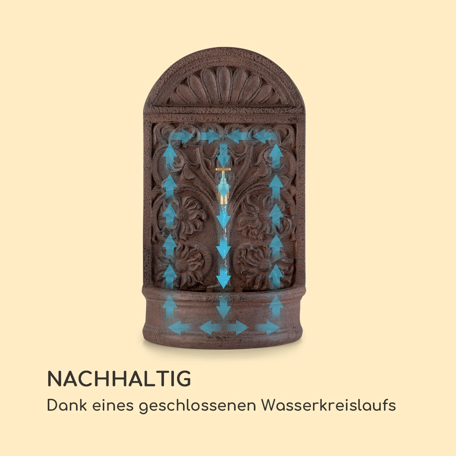 Die klassische Optik des blumfeldt Blumquell Brunnens erinnert an Wasserspiele aus dem antiken Rom. Das florale Muster und die abgerundete Form in Kombination mit modernen Materialien machen ihn zu einem echten Hingucker in deinem AuĂenbereich. Da der Blumquell mit Sonnenenergie betrieben wird und ĂŒber einen geschlossenen Wasserkreislauf verfĂŒgt, ist er nachhaltig und umweltfreundlich. Durch das 5 m langen Kabel kannst du flexibel entscheiden, wo du deinen Tempel der Entspannung aufstellen möchtest. Der Dekobrunnen ist aus robustem Kunststein gefertigt und sieht tĂ€uschend echt aus, dabei ist er mit nur 7 kg ein echtes Leichtgewicht. DrauĂen fĂŒgt sich der blumfeldt Blumquell Zierbrunnen optimal in dein Garten-Ambiente ein und erstrahlt dank der integrierten LED-Beleuchtung im Auffangbecken, in den Abendstunden, in einem weiĂen Licht. Die verbaute 2000 mAh Batterie versorgt den Blumquell auch in der Nacht mit ausreichend Energie fĂŒr einen reibungslosen Betrieb.