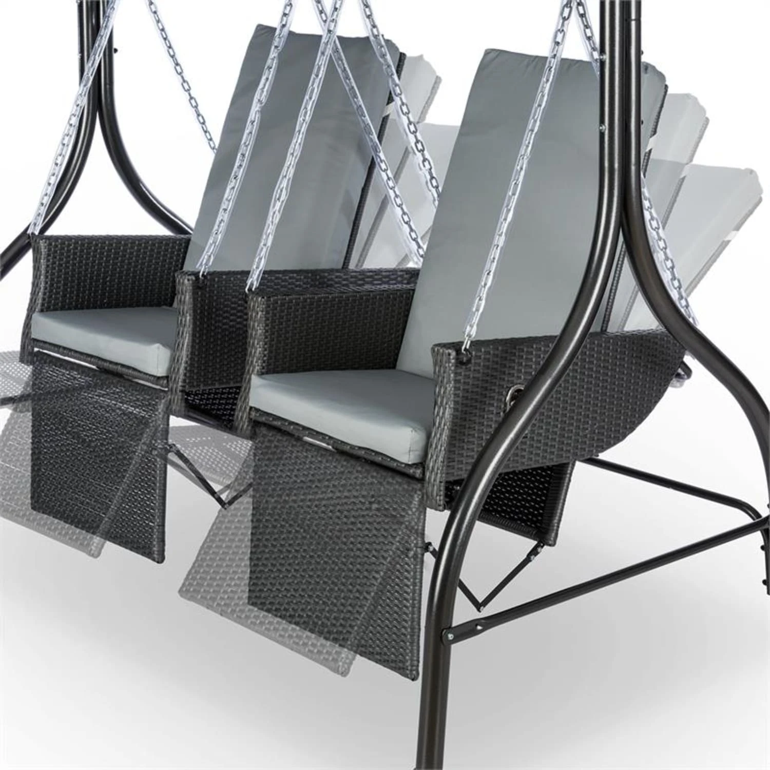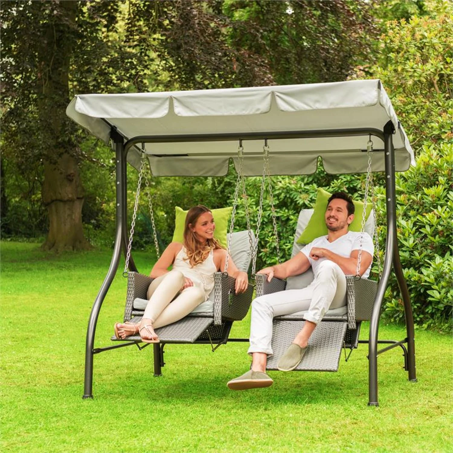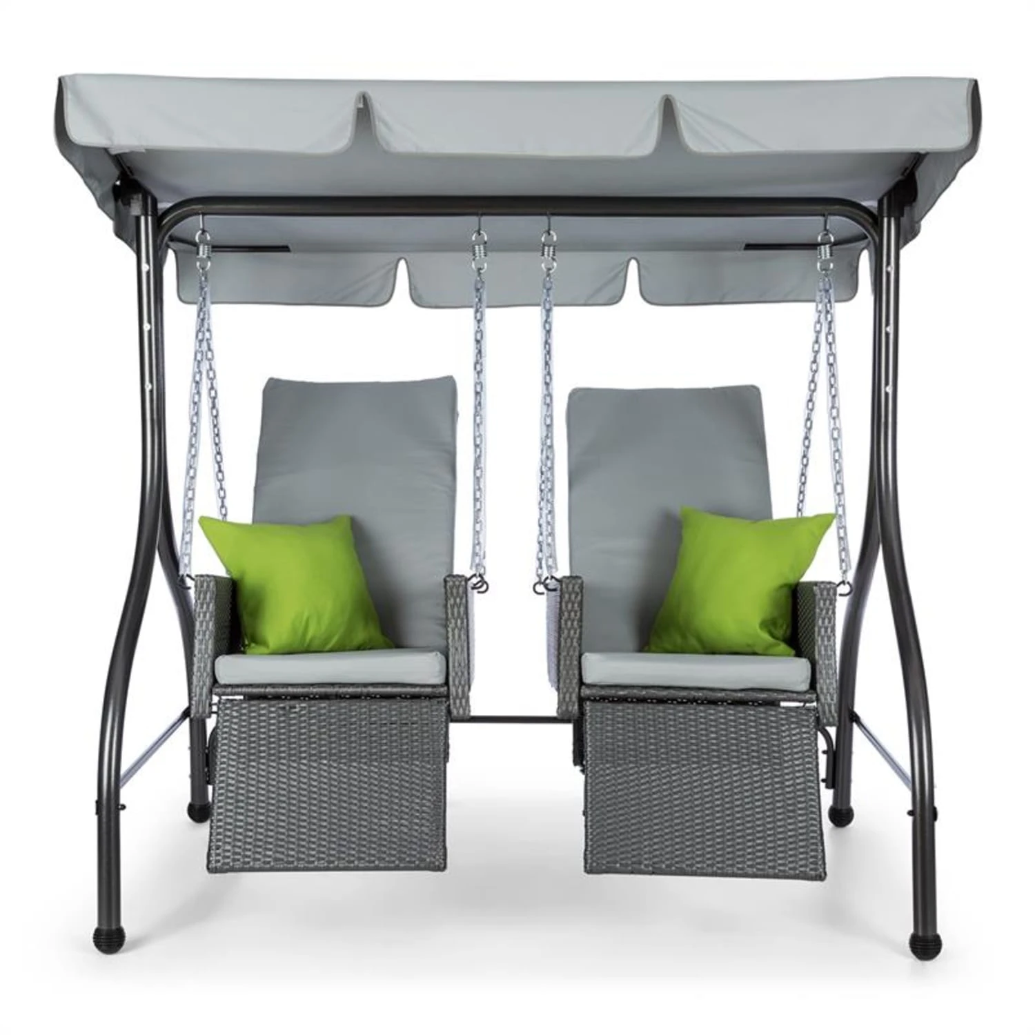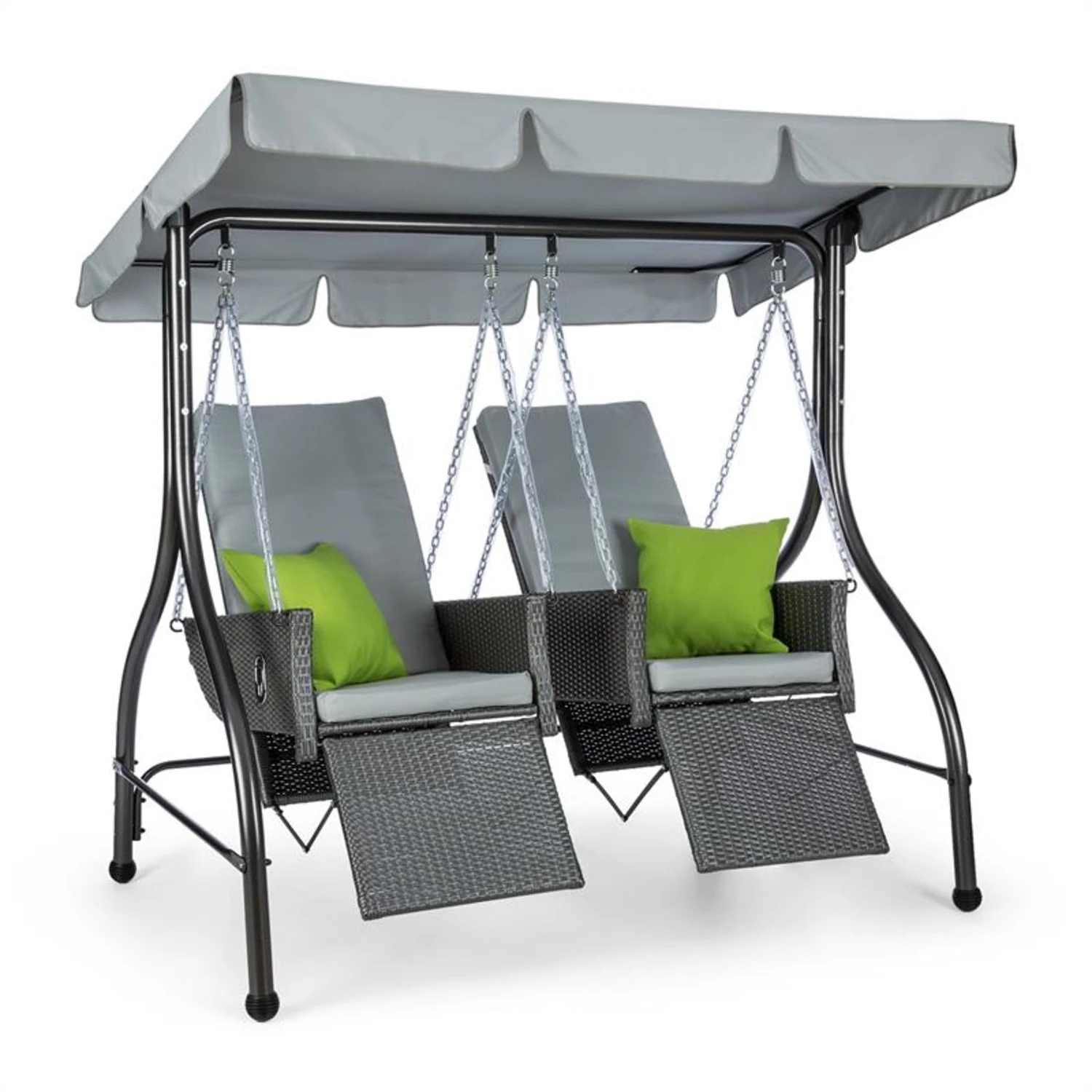 Die Blumfeldt Concordia Hollywoodschaukel macht es ganz leicht, gemeinsam den Alltag zu vergessen. Dank zwei separat aufgehängten Sitzen aus Polyrattan mit 6 cm dicker Polsterung schaukelt es sich allein oder zu zweit komfortabel wie in einem Liegestuhl. Bei beiden Sitzen lässt sich die Rückenlehne nach Wunsch einstellen – so genießt man heute individuell gemeinsam: Liegen oder Sitzen, Schaukeln oder Ruhen! Das fest installierte, kippbare Sonnendach bringt zusätzliche Geborgenheit und spendet wohltuenden Schatten – egal wo die Schaukel ihren Platz findet. Auch in puncto Standsicherheit bleiben keine Wünsche offen. Massives, pulverbeschichtetes Stahlrohr, rostfreie Edelstahlketten und vollverzinkte Schrauben sorgen für eine hochstabile Konstruktion die mit bis zu 250 kg belastbar ist.