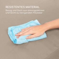 Der robuste Stahlrahmen mit Pulverbeschichtung verleiht der blumfeldt Garden Grove Schwingliege jederzeit einen stabilen Stand. Die extra weiche Liegefläche mit ihrer 6 cm dicken Polsterung und einem abziehbaren und waschbaren Bezug ist nicht nur besonders beständig, sondern bietet mit einer Fläche von 148 x 200 cm (BxT) auch ausreichend Platz für 2 Personen. Zwei robuste Seilschlingen ermöglichen entspannende Schaukelbewegungen und verleihen der Garden Grove ein angenehmes Gefühl bewegter Schwerelosigkeit. Das großflächige Sonnendach spendet auch bei starker Sonneneinstrahlung jederzeit zuverlässig Schatten. Schrauben aus Edelstahl garantieren darüber hinaus die Langlebigkeit der Konstruktion, die trotz ihrer hohen Stabilität mit einem geringen Gewicht von nur knapp 30 kg überzeugen kann.