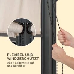 Besonders bei schräger Sonneneinstrahlung, Wind oder Regen kommen die 4 flexiblen Seitenteile zum Tragen, die je einzeln per komfortablem Auf- und Abrollmechanismus geöffnet und geschlossen werden können und aus waschbarem 160 g-Polyester gefertigt sind. Beim Aufbau der Konstruktion ist es ratsam, auf eine besonders senkrechte Verankerung der Standfüße im Boden zu achten, um einen gleichmäßigen und faltenfreien Auf- und Abrollvorgang zu gewährleisten.