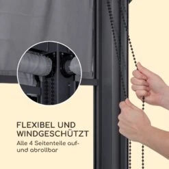 Besonders bei schräger Sonneneinstrahlung, Wind oder Regen kommen die 4 flexiblen Seitenteile zum Tragen, die je einzeln per komfortablem Auf- und Abrollmechanismus geöffnet und geschlossen werden können und aus waschbarem Polyester gefertigt sind. Beim Aufbau der Konstruktion ist es ratsam, auf eine besonders senkrechte Verankerung der Standfüße im Boden zu achten, um einen gleichmäßigen und faltenfreien Auf- und Abrollvorgang zu gewährleisten.