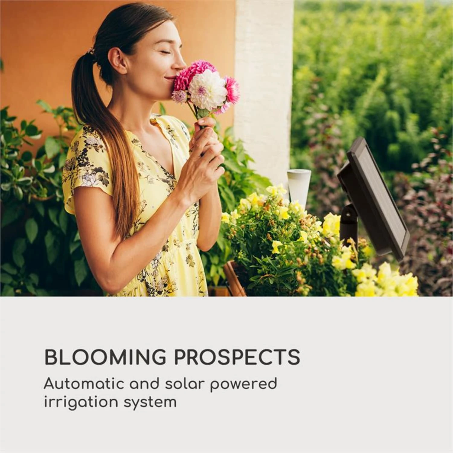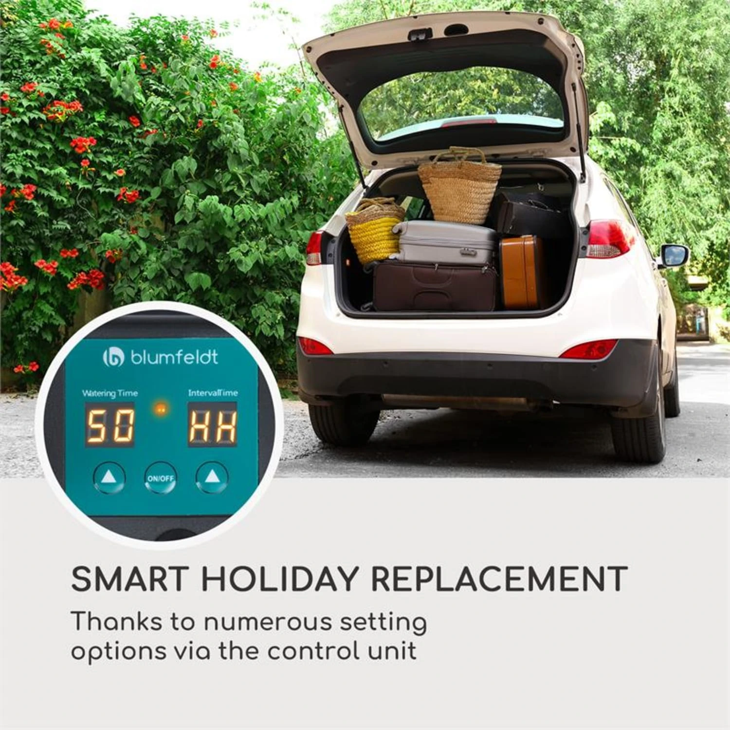 Damit es auch nach dem Urlaub auf Balkonien noch blüht: das Blumfeldt Greenkeeper Solar Bewässerungssystem macht’s möglich. Denn die smarte Urlaubsvertretung versorgt bis zu 40 Topf- und Gartenpflanzen und bewässert vollautomatisch per Steuergerät. Das wasserspendende Set wird mit einem Solarpanel betrieben und benötigt keine zusätzliche Stromversorgung. Somit kann es auch im Garten sowie auf freiem Feld verwendet werden, sofern in der Nähe eine Wasserquelle wie beispielsweise eine Regentonne vorhanden ist. Das Gerät ist somit eine besonders umweltfreundliche, stromsparende und flexibel einsetzbare Alternative zu kabelgebundenen Systemen.