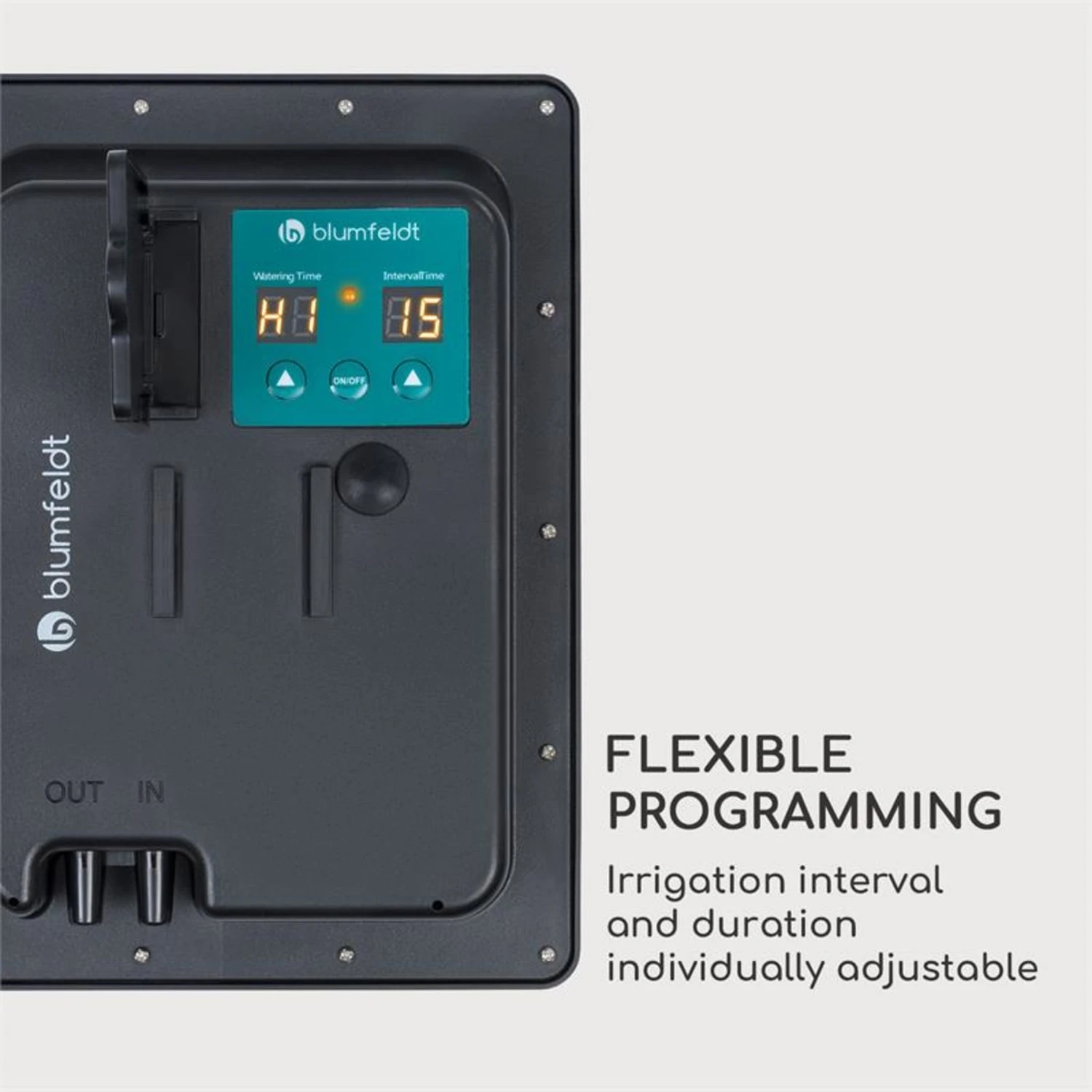 Mit Hilfe des Greenkeeper Solar kann die Bewässerung nach individuellen Bedürfnissen programmiert werden. Im Takt von 12 Stunden, bzw. im Intervall von 1-15 Tagen schaltet sich die Pumpe ein und sorgt für eine kurze Erfrischung von 10-50 Sekunden oder für eine tiefe Bewässerung von 1-9 Minuten.
