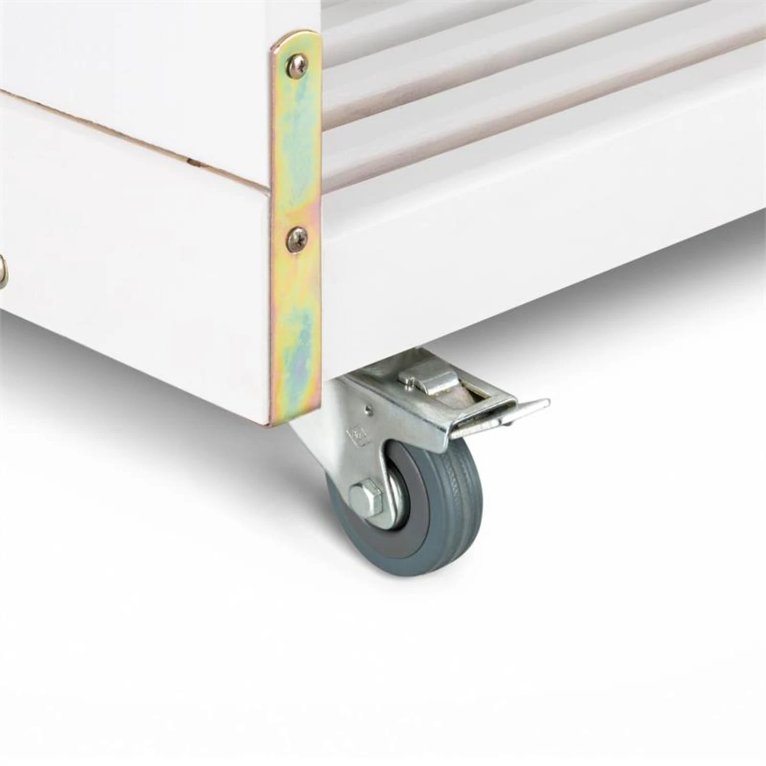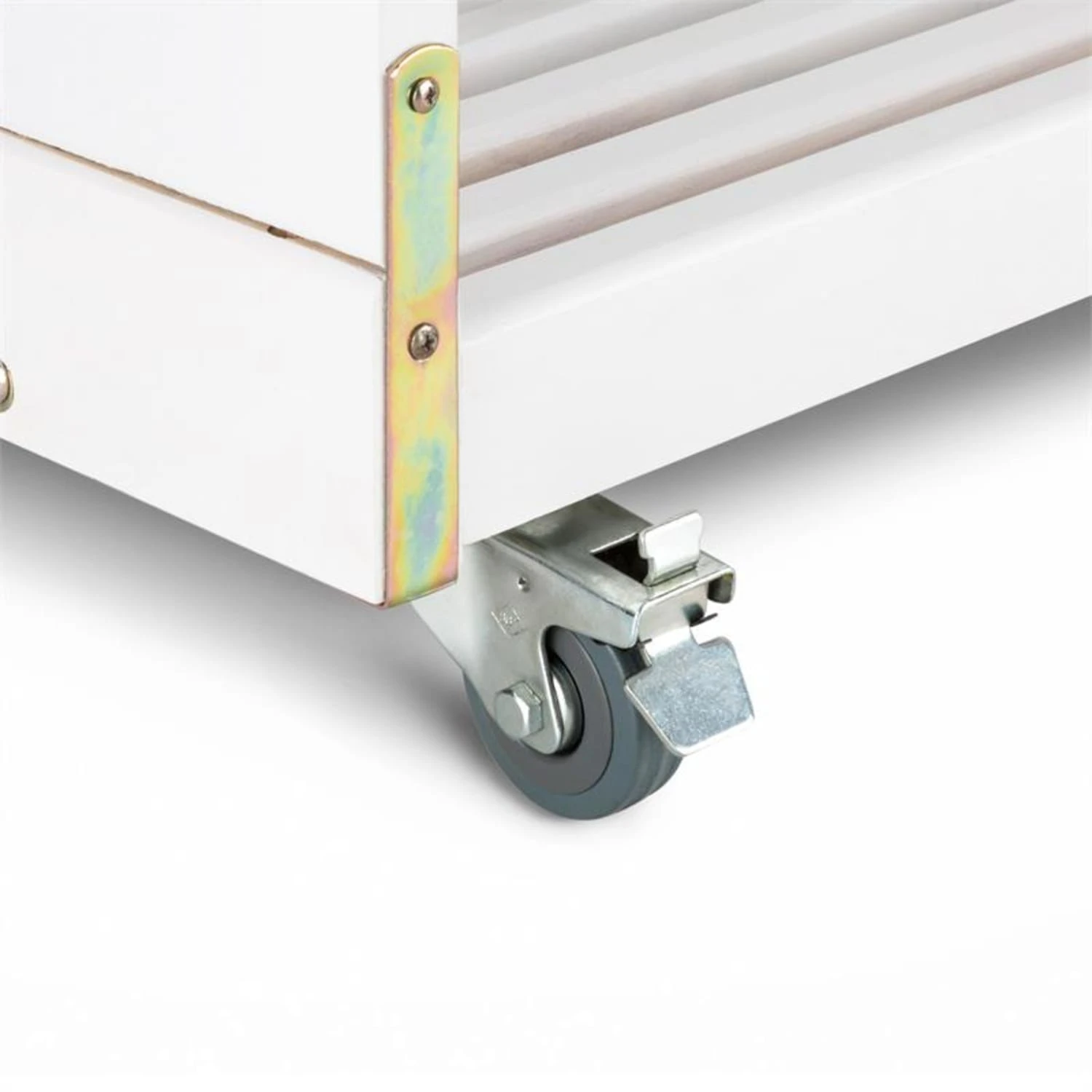 Die 5 Rollen werden in wenigen Handgriffen auf die Unterseite des Strandkorbes geschraubt und überzeugen mit einer Tragkraft von 100 kg je Doppelrolle. Zwei der 5 Transportrollen sind darüber hinaus mit einer Feststell-Bremse versehen, so bleibt der Strandkorb fest und sicher an seinem neuen Standort.