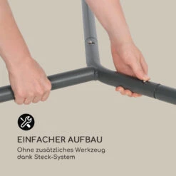 Der robuste Ischia Hängesitz-Rahmen ist dank seiner 3,2 Ø cm dicken Stahlrohre sehr stabil und kann problemlos bis zu 300 kg Gewicht tragen. Durch seine verzinkten Rohre und die Pulverbeschichtung ist er wetterbeständig und für den Außeneinsatz bestens vorbereitet. Zusätzliche Sicherheit verleiht die vierbeinige Konstruktion, die das Gerüst vor dem Umkippen schützt. Durch das Steck-System ist der Aufbau im Nu vollbracht und erfordert kein zusätzliches Werkzeug. Abgerundet wird das Hängesitz-System durch eine starke Metallkette und einen Karabinerhaken, die das Aufhängen von Hängesitzen zum Kinderspiel machen.