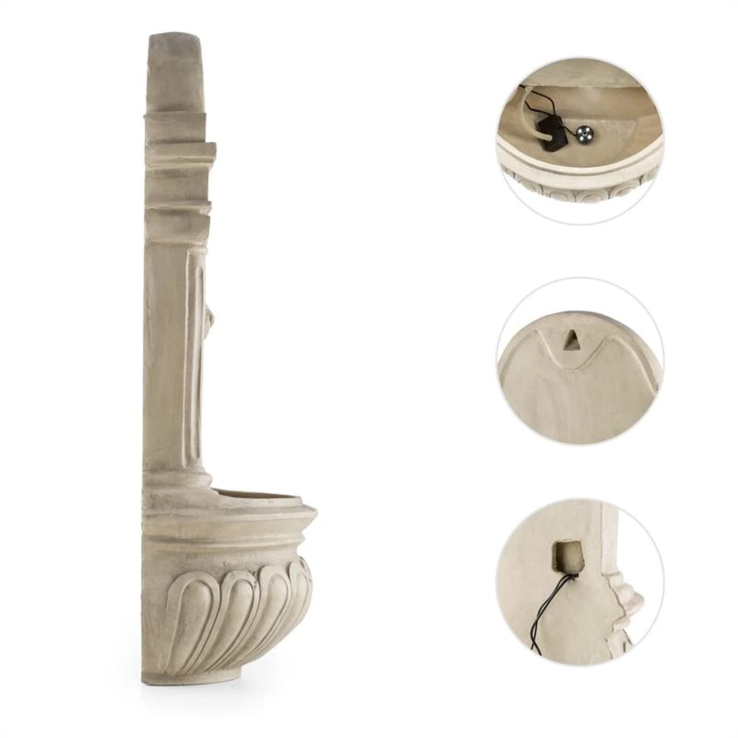 Der Blumfeldt Löwenstein Gartenbrunnen verwandelt nackte Wände in altgriechische Wasserlandschaften. Der Wandbrunnen ist robust aus Polyresin in Naturstein-Optik gefertigt. Eingefasst von dorischen Säulen und antiken Ornamenten, strömt aus einem stolzen Löwenhaupt das kühle Nass hervor und verzaubert die Sinne. Eine kleine aber leistungsstarke Pumpe sorgt mit 200 Litern Wasserumlauf pro Stunde für einen steten Strom, Wasser muss nicht nachgefüllt werden. Für nächtliche Beleuchtung sorgt ein kleiner LED-Kranz, der das Wasser zusätzlich zum Funkeln bringt. Damit erschöpft sich die Leistung des Brunnens aber noch längst nicht: Statt aus der Steckdose kommt hier der Strom ganz Umwelt- und Geldbeutel-freundlich aus einem 2 W starken Solarpanel, das dank langer Zuleitungskabel und 30 cm langem Erdspieß frei an den besten Sonnenplätzen postiert werden kann. Neben dem Betrieb der Pumpe lädt es zusätzlich auch den integrierten 3,7 V / 2000 mAh Li-Akku auf, damit das sanfte Plätschern auch die Nacht erfüllen kann.