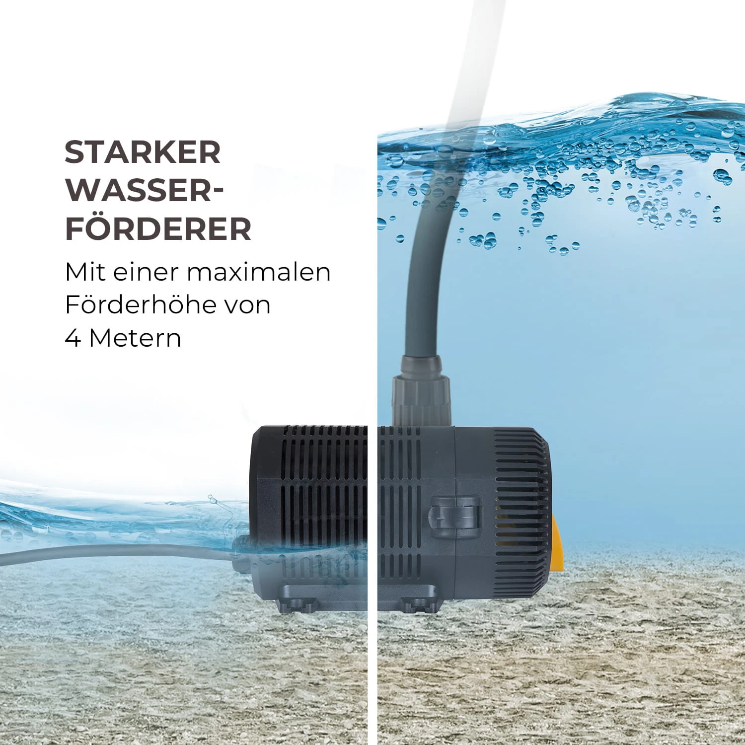 Durch einen sparsamen Verbrauch ist die Pumpe der ideale Helfer bei der dauerhaft notwendigen Wasserumwälzung in Bachläufen und Fischteichen. Auch zum Betrieb eines Springbrunnens oder zur Förderung von Wasser aus Regentonnen ist die Nemesis T90 bestens geeignet. Mit ihrer Förderung von bis zu 6200 Litern pro Stunde bewegt sie große Wassermengen und kann somit die notwendige Sauerstoffzufuhr im Gewässer sicherstellen. Für den einfachen Anschluss liefert die Teichpumpe ein Adapterset inklusive Dichtungsring mit, das die Verbindung mit 3/4“- und 1“-Schläuchen ermöglicht. Zur einfachen Reinigung des Pumpensystems verfügt die Waldbeck Nemesis T90 über ein Schnellentriegelungssystem, um sie mit wenigen Handgriffen zu zerlegen. Ein Filterkorb verhindert zudem, dass Laub oder Wasserpflanzen ins Innere der Teichpumpe gelangen können. Für einen festen Stand sorgen 4 Gummistandfüße und die Sicherheit ist dank Schutzklasse IPX8 jederzeit gewährleistet.