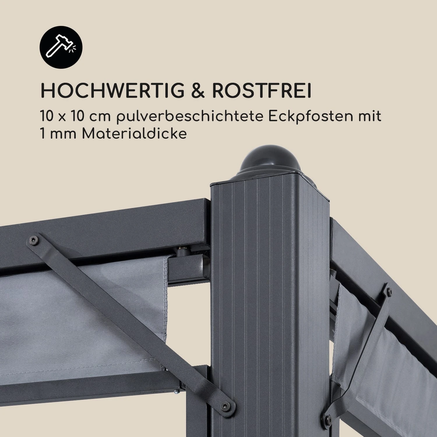 Mit dem stufenlos raffbaren Stoffdach aus 180 g/m² Polyester erhält man die volle Kontrolle über Schatten und Sonne. Der Seilzug lässt das Sonnendach des Pavillons in seinen Führungsschienen geschmeidig vor- und zurückgleiten, die wasserabweisende Beschichtung schützt vor Schimmel und kurzen Regenschauern. Durch die flexibel auf- und abrollbaren Seitenteile aus 160 g/m² Polyester-Stoff bleibt man die ganze Zeit windgeschützt.