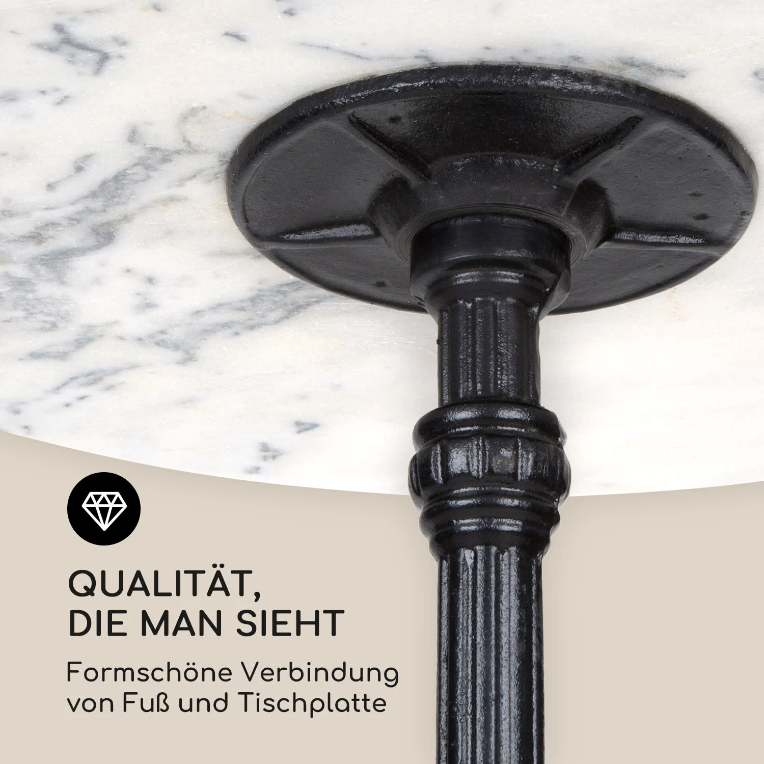 Der Patras Taverna Bistrotisch ist besonders formschön und sowohl für drinnen als auch draußen geeignet: Die 60 cm durchmessende Tischplatte ist aus sauber poliertem, echten Marmor und macht jeden Tisch zu einem Unikat. Maserung und Färbung des Gesteins bringen immer wieder einen ganz eigenen Charakter hervor und verleihen jedem Umfeld neuen Glanz. Der stabile, gusseiserne Dreibein-Standfuß mit floralen Verzierungen verstärkt diesen Effekt zusätzlich und der 4-Seasons-Marble lässt sich nicht nur besonders einfach reinigen, er ist auch unempfindlich gegen Wasser und Frost.