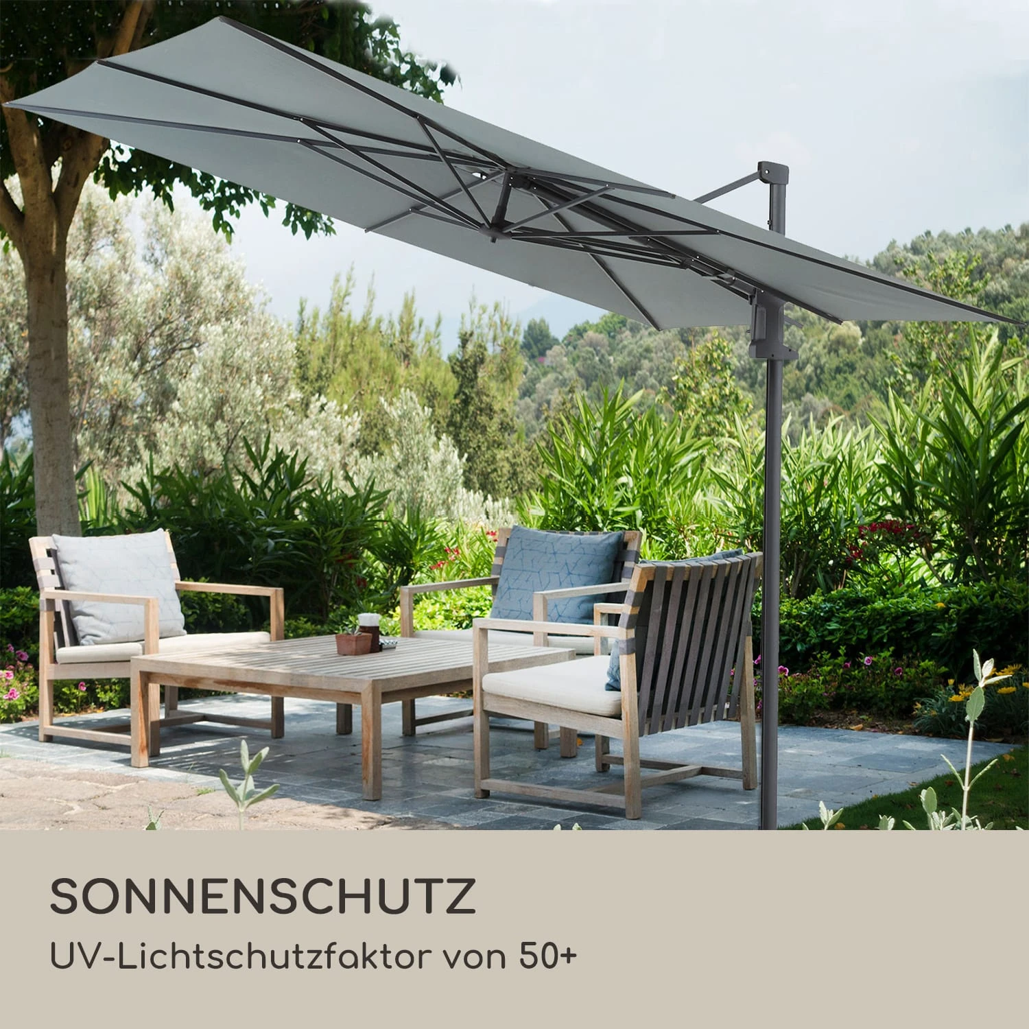 Alles was du für einen sonnigen und entspannten Tag im Garten oder auf der Terrasse brauchst: der blumfeldt Saint-Tropez Ampelschirm.