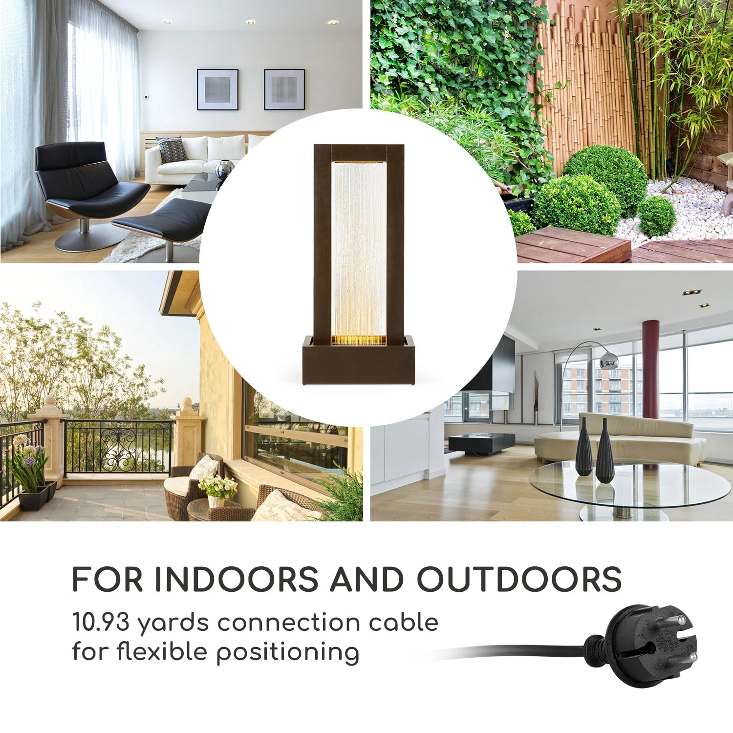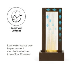 Mit dem sanften Plätschern des Blumfeldt Skyriver Zierbrunnens wird das Relaxen gleich noch mal so schön. Aus seiner großen Pforte ergießt sich eine 20 cm breite Kaskade in einem sanft plätschernden Wasserspiel in das Brunnenbecken und sorgt so für meditative Entspannung. Aber nicht nur mit dem vollen, steten Schwall des Wassers weiß der Brunnen das Auge zu erfreuen: Direkt aus dem Brunnenbecken sorgt ein 20 cm breiter LED-Streifen für das Erstrahlen des Wassers mit warmweißen Lichtreflexen. Der kubistisch angehauchte Brunnenbogen aus verzinktem Metall ist mit einem Finish in Bronze-Optik versehen. So erfreut der Skyriver optisch und akustisch das Gemüt. Dabei ist er nicht nur äußerst robust und witterungsbeständig aus Metall gefertigt, sondern auch vollverzinkt: Ohne Rost und Anlaufen fügt er sich perfekt in vielerlei Ambiente ein. Damit sich das Wasserspiel niemals erschöpft, wird es von einer 12 W starken Pumpe in stetigem Umlauf gehalten. Sanft Rauschend entfaltet es eine äußerst meditative Wirkung und erfrischt seine Umgebung.