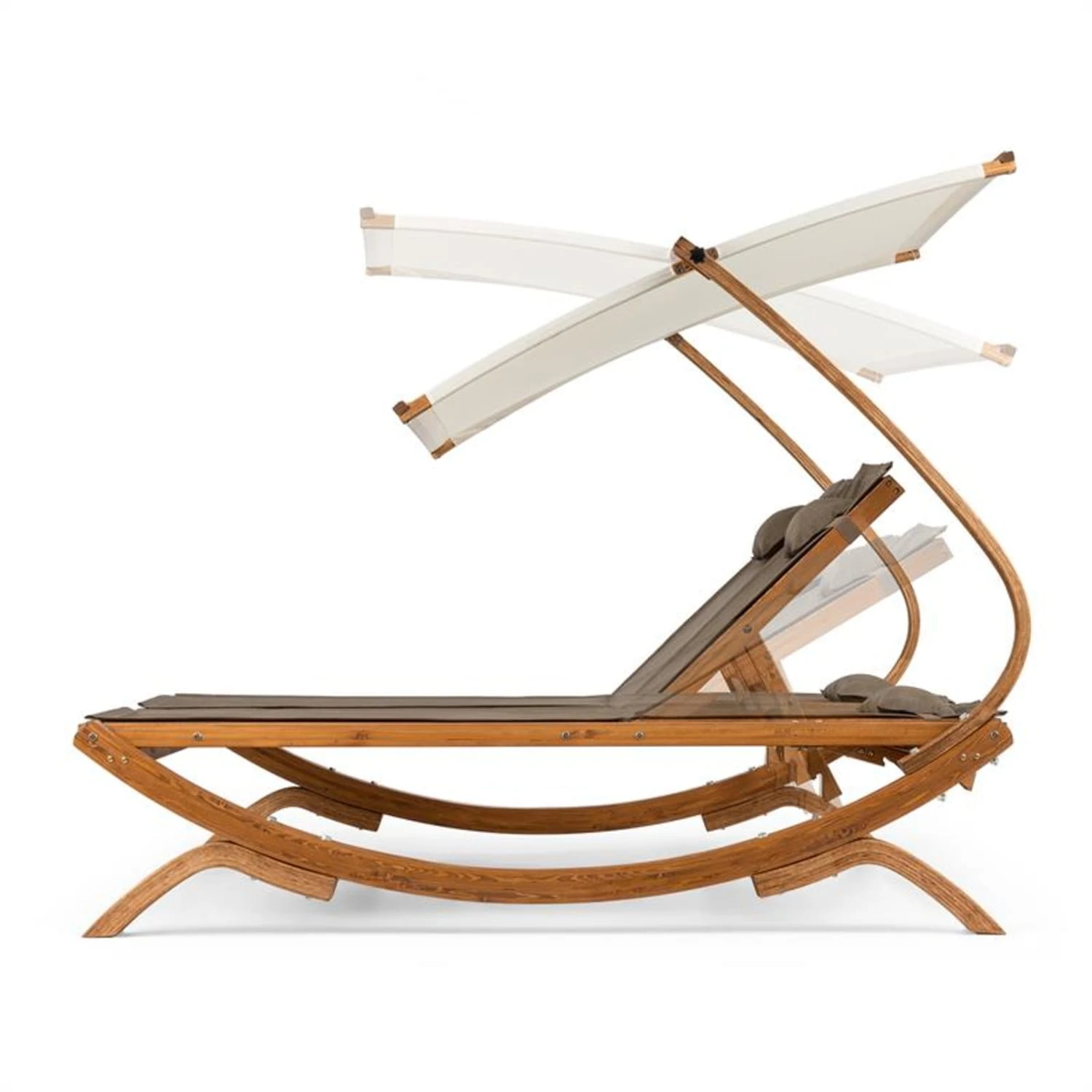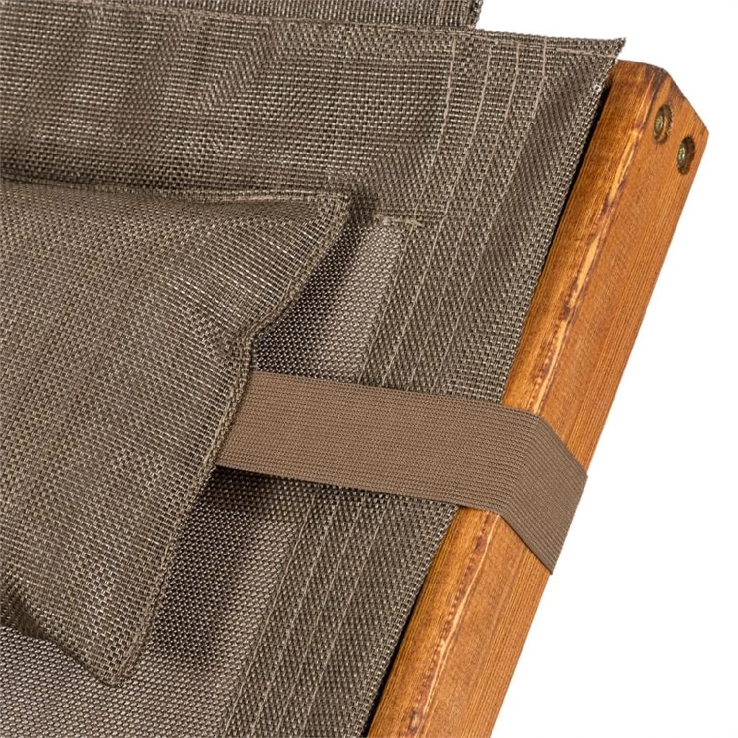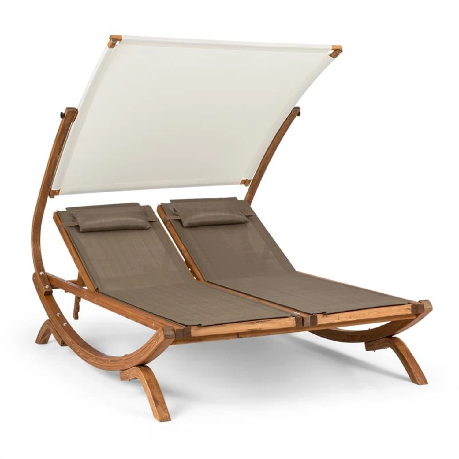 Gemäß des 5 Sterne Standards wartet die Blumfeldt Sonnenliege mit höchstem Luxus auf. Form, Farbe und Komfort bilden dabei einem harmonischem Dreiklang für verträumte Stunden im Grünen. Ein Farbkonzept in edlen Naturtönen sowie die moderne, abgerundete Form ergeben ein anmutiges Erscheinungsbild der Doppelliege. Wie auf einer bequemen Hängematte sorgt die gespannte Liegefläche aus atmungsaktiven Polyester-Gittergewebe für einen angenehm belüfteten Untergrund. Zusätzlich empfangen zwei Kopfkissen sanft die nach Erholung strebenden Seelen Bäumler. Die stabile Lärchenholz-Konstruktion geizt nicht mit Platz: eine extragroße Liegefläche lädt zum ausgiebigen Relaxen zu zweit ein und bietet auch großen Personen genug Raum, um bequem Entspannen zu können.