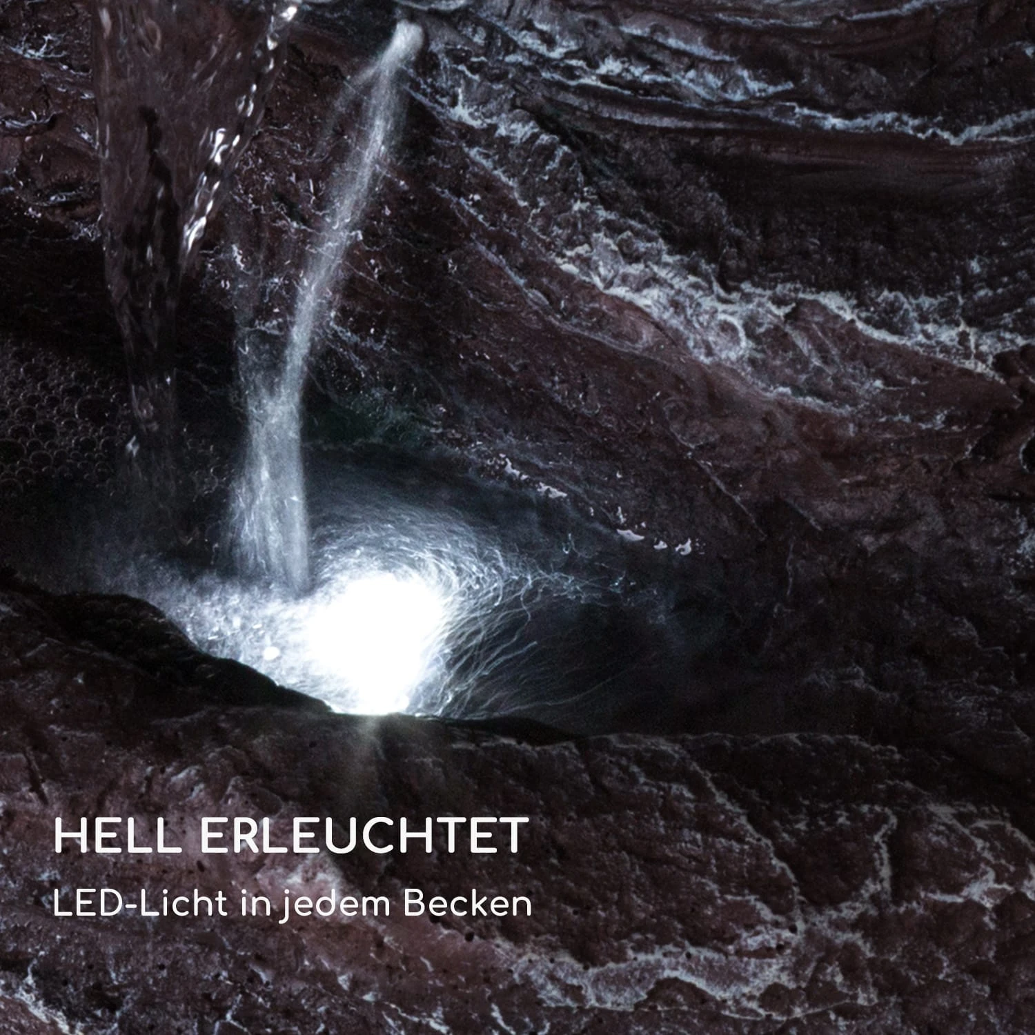 Besonders in den Abendstunden sorgt der blumfeldt Stonehenge XL Solarbrunnen für eine gemütliche Idylle. Denn jedes Becken ist mit einem LED-Licht im Wasser ausgestattet. Durch die Wasserbewegungen ergeben sich so schöne, lebendige Effekte.