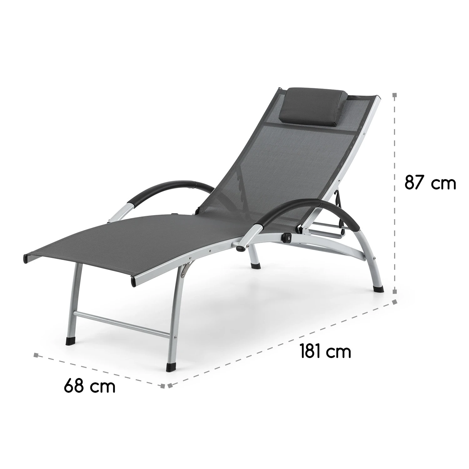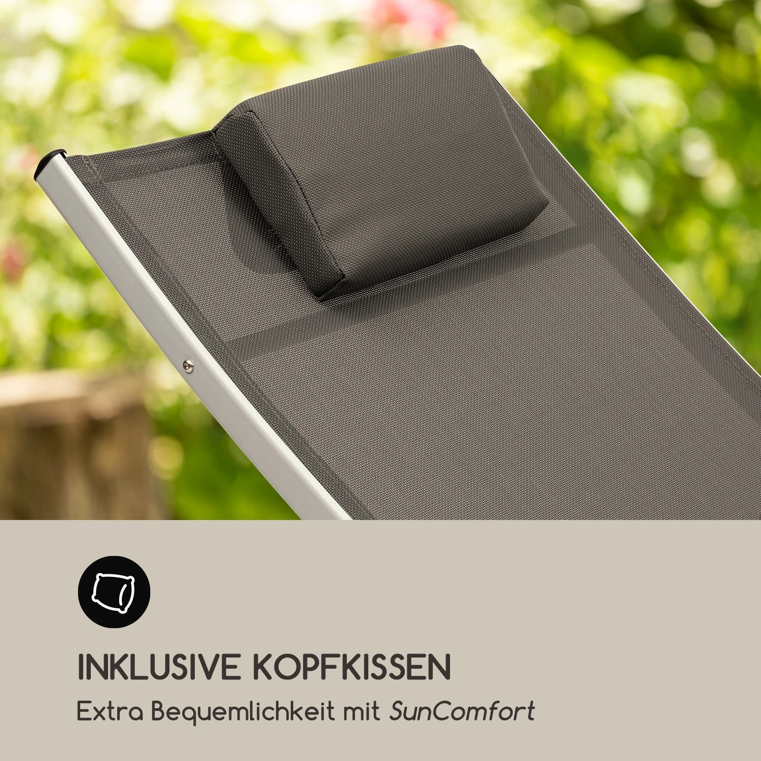 Die Sonnenliege bietet eine Entspannungsfläche aus luftdurchlässigem Comfort Mesh, das hervorragend für warme Sonnentage geeignet ist und sich durch die pflegeleichte Textilstruktur besonders einfach reinigen lässt. In vier Stufen bei einer Höhe von 50-87 cm passt sich die verstellbare Rückenlehne jederzeit mit wenigen Handgriffen den eigenen Bedürfnissen an. Das Kopfkissen bietet nochmal extra Bequemlichkeit und vervollständigt das Sun Comfort-Design.