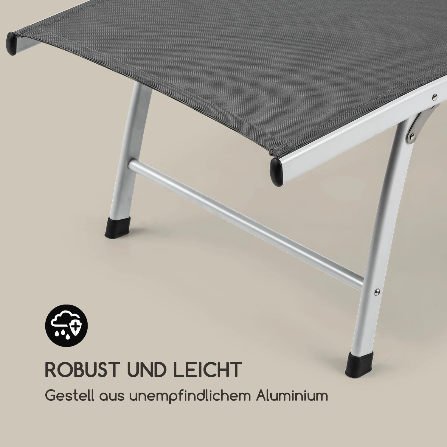 Der stabile Rahmen aus Aluminium ist nicht nur robust, er ist auch besonders leicht. Durch die Möglichkeit, die Sonnenliege besonders flach zusammenzuklappen, lässt sich das Leichtgewicht schnell überall verstauen und benötigt dabei besonders wenig Platz.