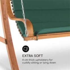 „Stilvoller Komfort und hohe Belastbarkeit: 110 cm breite SitzflĂ€che mit 4 cm dicken Sitzpolstern und Sonnendach. Maximale Belastung von 250 kg durch LĂ€rchenholzbalken und vollverzinkte Stahlketten.“