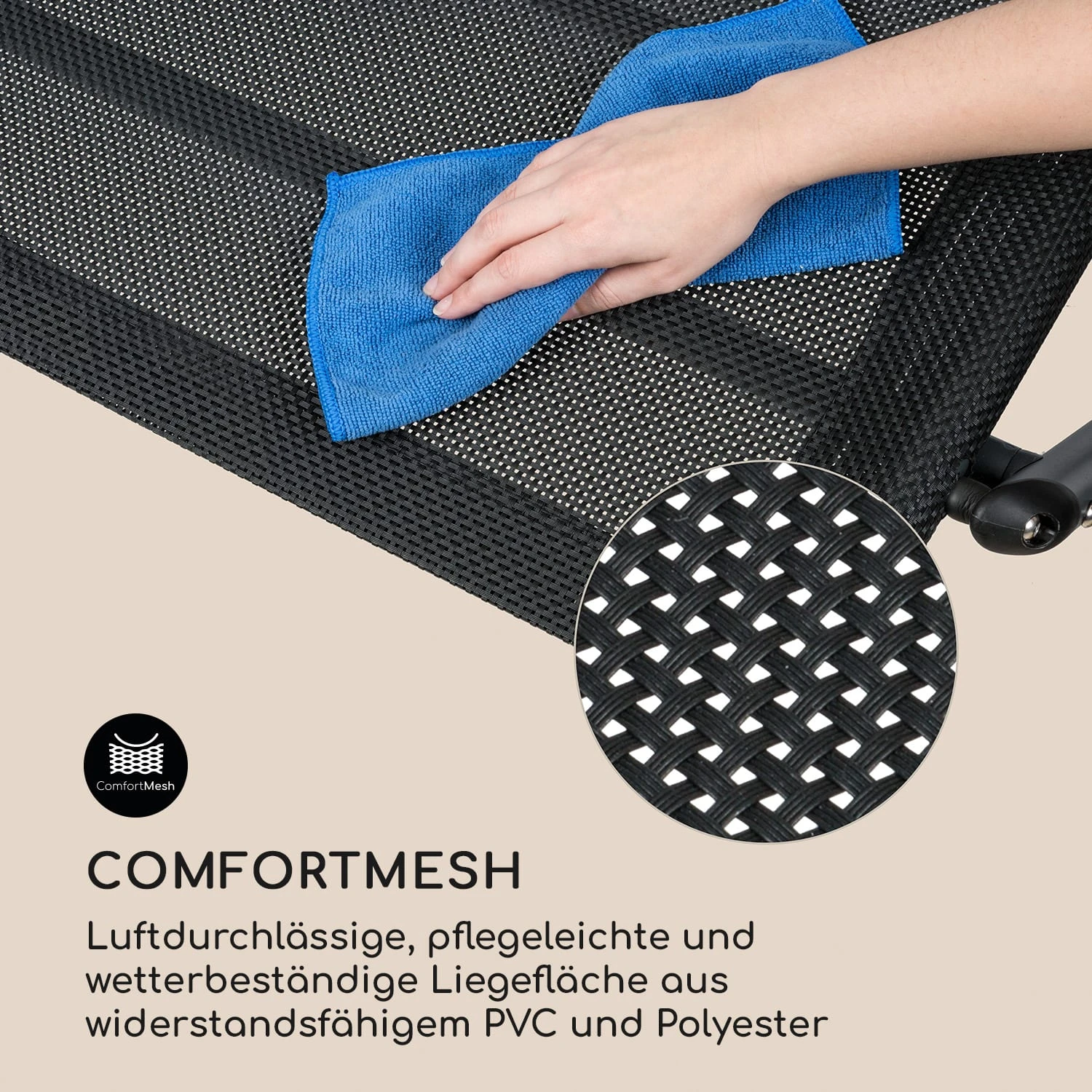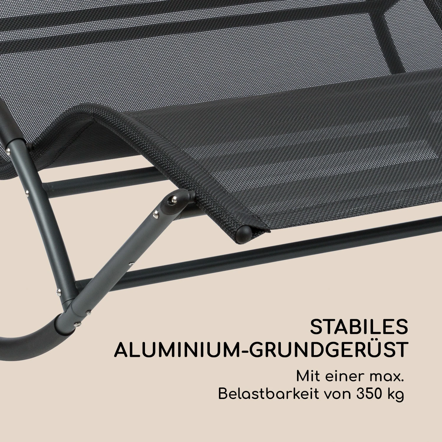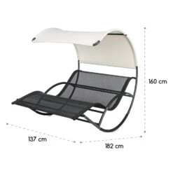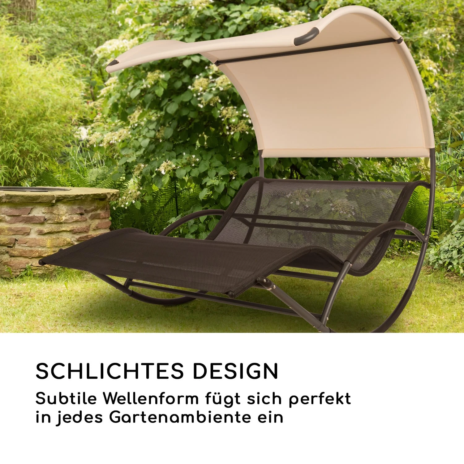 Erholung pur! Verwandeln Sie Ihr Zuhause mit der Blumfeldt The Big Easy Schwingliege in eine Insel der Entspannung. Die Wohlfühloase verfügt über einen stabilen Stahl-Rahmen, der durch seine Pulverbeschichtung vor äußeren Einflüssen geschützt wird. Das Grundgerüst ist mit einem wasserdichten Dach sowie einer Liegefläche (LxB: 200 cm x 130 cm) für 2 Personen bespannt und ermöglicht ein Tragegewicht von bis zu 350 kg. Die schaukelnde Ruhestätte fügt sich durch ihr wellenförmiges Design perfekt in jedes Gartenambiente ein und bietet an heißen Sommertagen verlässlichen UV- und Sonnenschutz über ein gewölbtes Schattendach, das bei Bedarf abgenommen werden kann. Die schaumgeschützte Standvorrichtung eignet sich zudem für sämtliche Bodenbeläge und macht dadurch sowohl eine In- als auch Outdoor-Nutzung möglich. Darüber hinaus unterstützt der ergonomisch geformte Liegebereich die natürliche Form der Wirbelsäule und bietet 2 Personen eine Entspannungsfläche aus bequemem ComfortMesh, das durch seine pflegeleichte Textilstruktur besonders einfach zu reinigen ist.